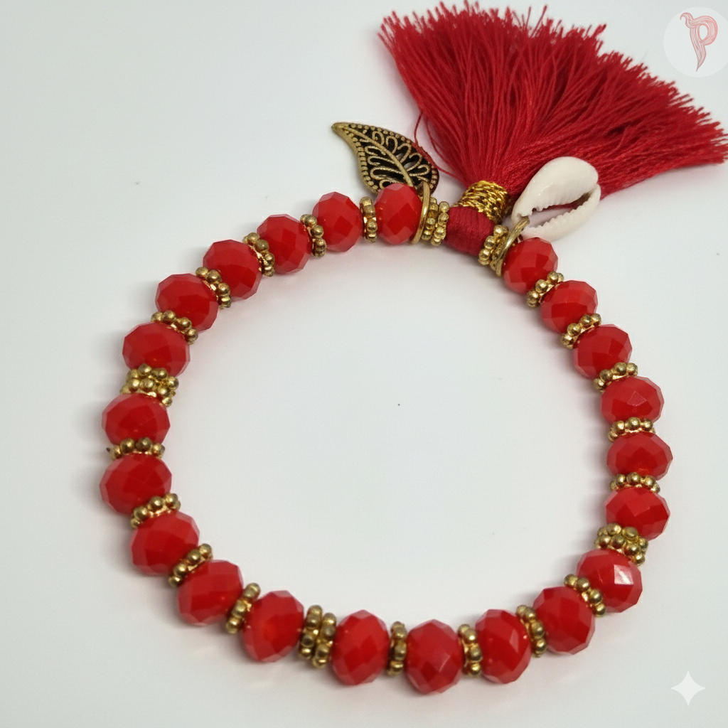Pilkupüüdev käepael on ideaalne aksessuaar igale, kes hindab stiili ja mugavust. Fasetitud punased pärlid annavad sellele elegantse ja luksusliku välimuse, samas kui kuldsed vahedetailid lisavad sära. Käepaela teeb eriliseks rippuv detailide kimp: siidine punane tutt, kaunis kuldne lehekujuline ripats ja väike teokarp, mis annavad aksessuaarile unikaalse ja boheemlasliku hõngu. Tänu tugevale elastsele disainile on ehet lihtne randmele asetada ja seda on mugav kanda kogu päeva.