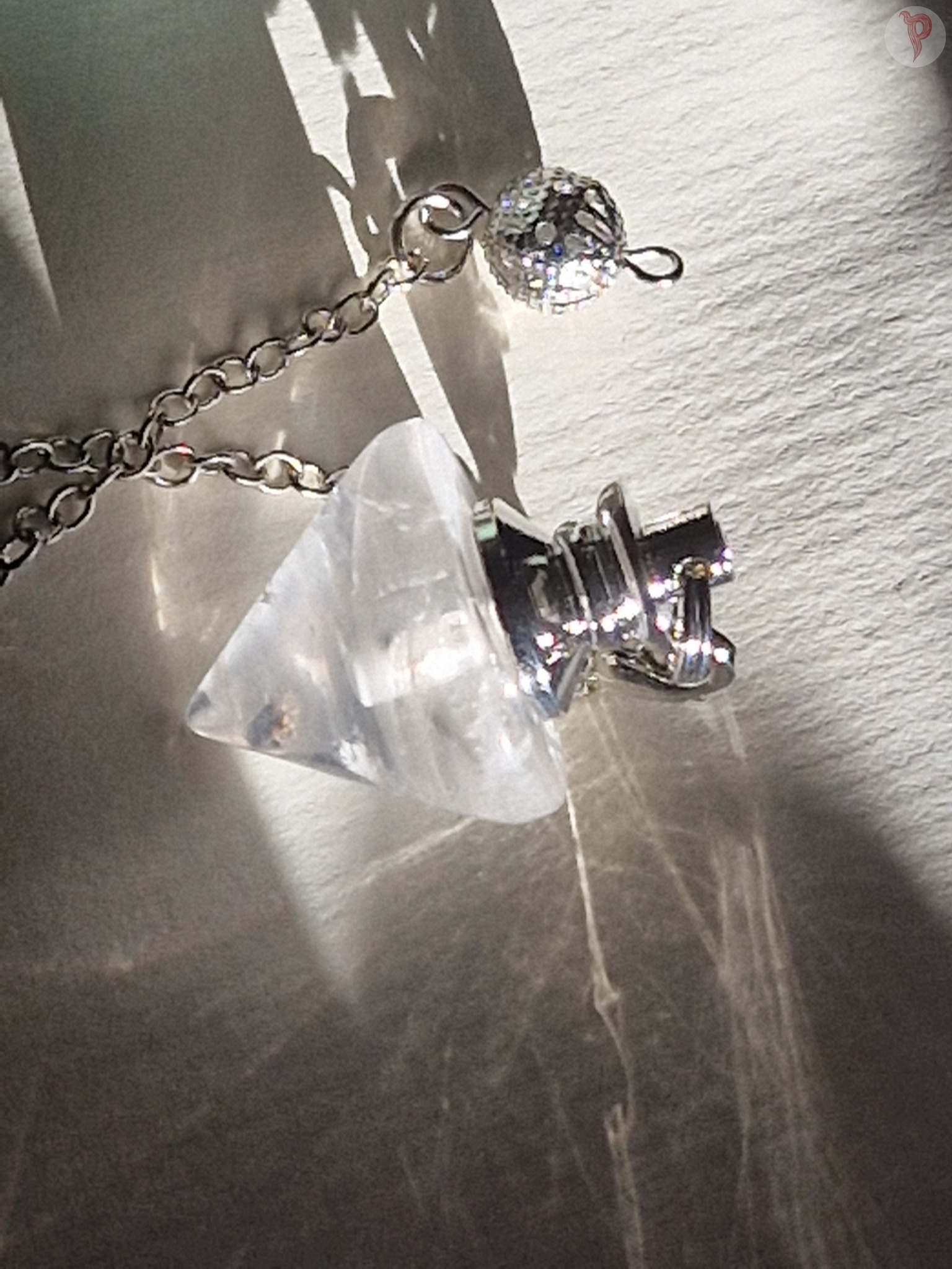 Pendli kristalli pikkus 2 cm, laius 2,3 cm. Keti pikkus 18, 5 cm.