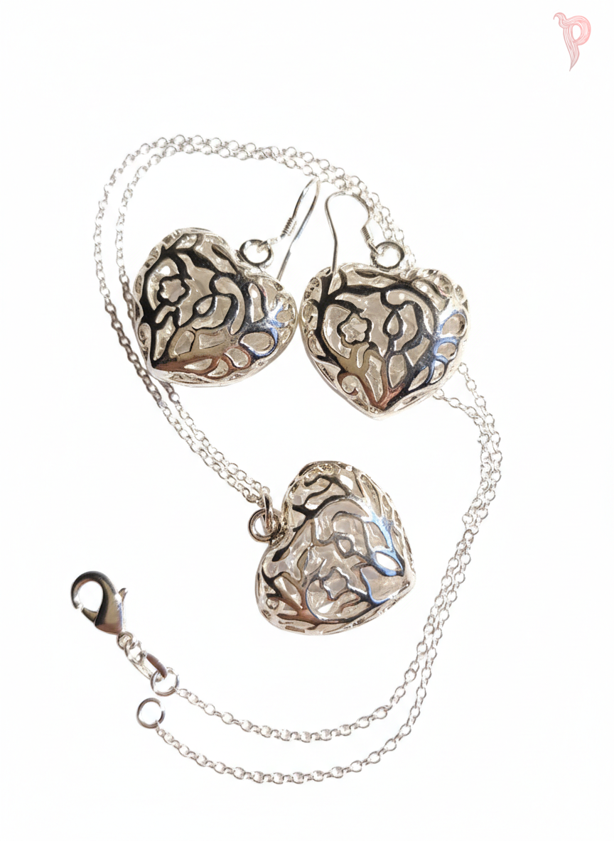 Kõrvarõnga südame osa mõõdud 22 x 24 mm, üld pikkus 35 mm. Ripatsil samad mõõdud. Keti pikkus 45 cm.