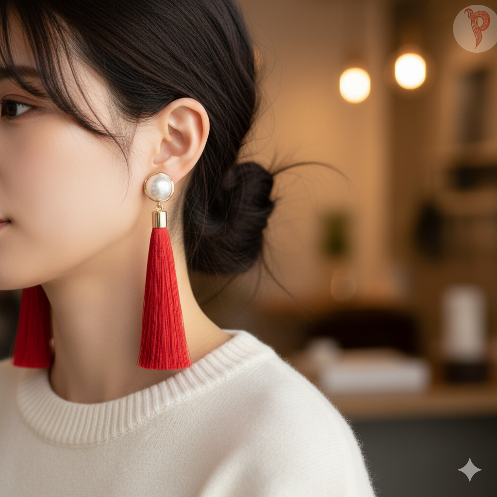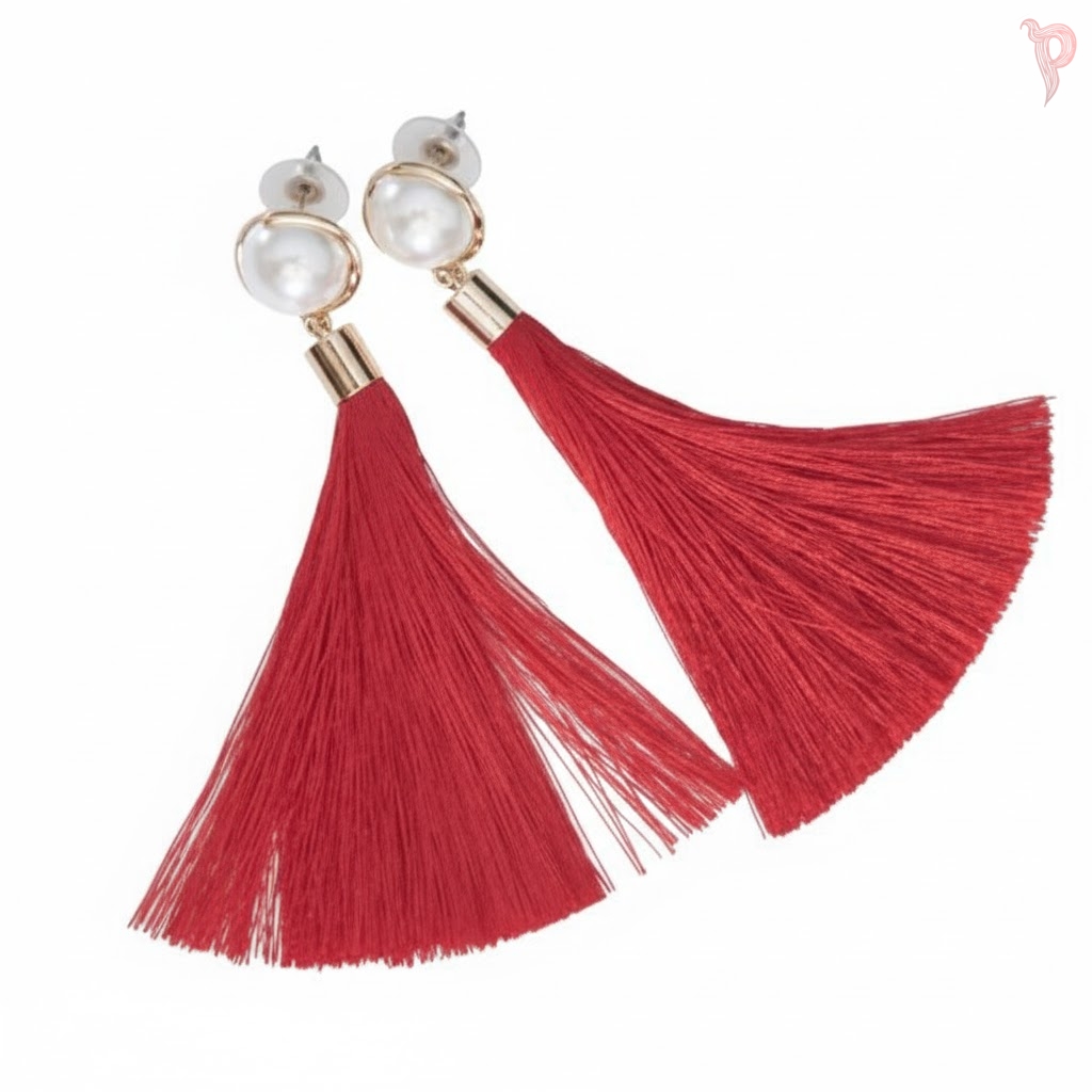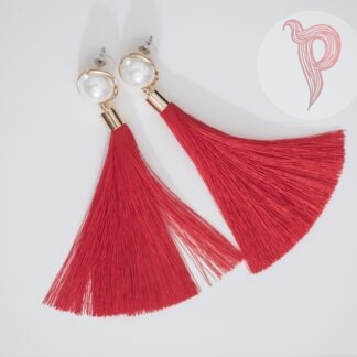 Elegantsete punaste tuttvõrvarõngaste (Tassel Earrings) üldpikkus 10 cm.  Metallne osa on kuldset värvi. Kõrvarõngad kinnituvad kõrva tihvt-kinnitusega (pulklukk), mis on tagant toestatud stopperiga. Kinnitus on paigutatud nii, et kõrvarõnga ilus kaunistatud ülaosa katab kõrvaaugu kenasti kinni.